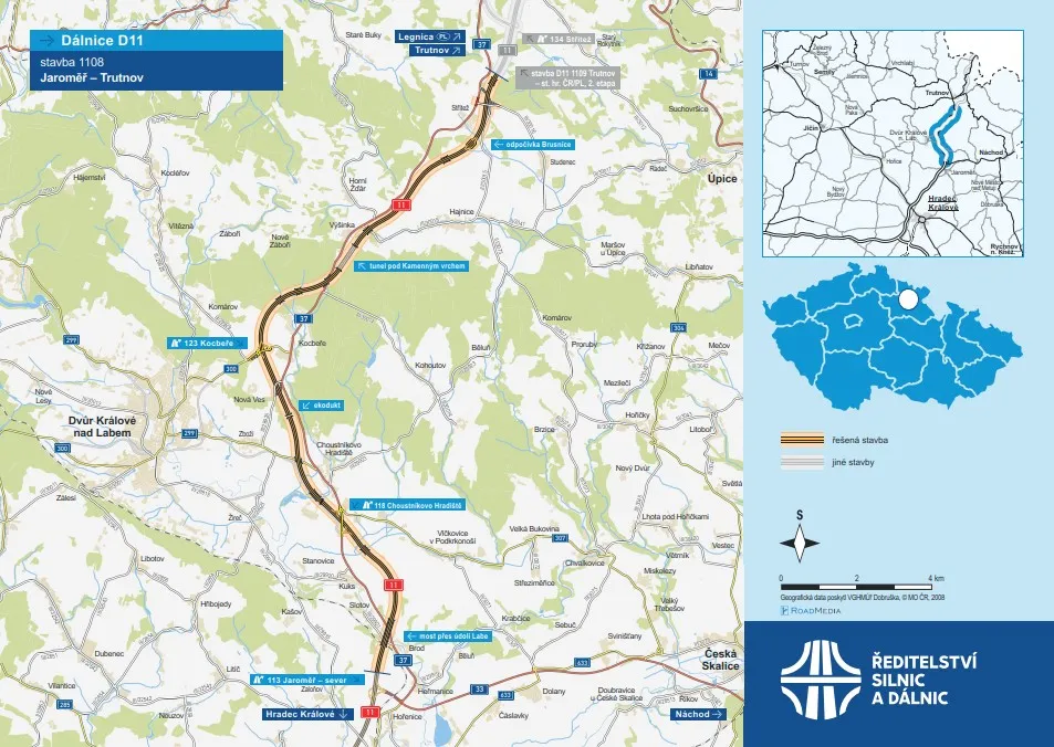 Nový úsek s označením D11 1108 měří téměř 20 kilometrů a je navržen v kategorii D 26,0/130. Začíná za mimoúrovňovou křižovatkou Jaroměř-sever a končí u Trutnova před MÚK Střítež, kde se napojí na další připravovanou část směrem ke státní hranici.